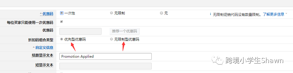 一次性和无限制的折扣码组合类型分两种:优先型优惠码,无限制优惠码