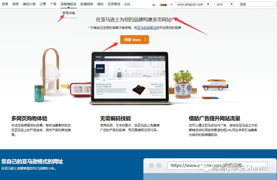 只针对有品牌的卖家,如果申请了品牌就可以创建一个品牌商店