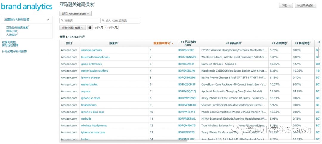品牌分析功能可以作为选品的一个维度。将关键词输入后,会生成一个报告,这里向品牌所有者展示,客户如何在亚马逊上搜索其产品及其竞争对手的产品。包括每个产品的相对搜索流行度,点击率和转化率。