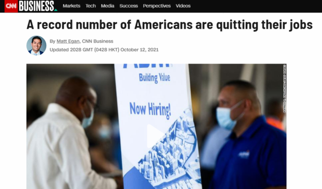 10月12日,美国劳工部在官网发布了就业数据报告,其中8月份全美有430万人辞职,数据创下2000年12月以来的新高。其中,制造、零售、贸易、运输、服务和公共事业等行业劳动力流失的情况最为严重。