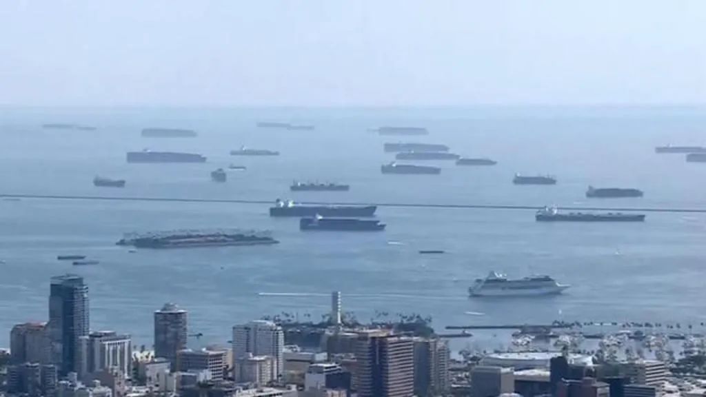 被困在洛杉矶港口附近的海域的货船