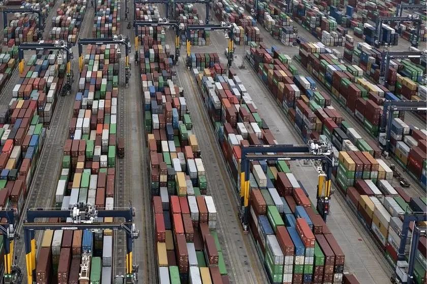 10月14日,英国第一大港口英格兰费利克斯托港集装箱堆积成山。马士基近日要求部分船只避开英格兰东部的费利克斯托港,因为卡车司机短缺导致费利克斯托港没有场地可以堆放更多集装箱了。