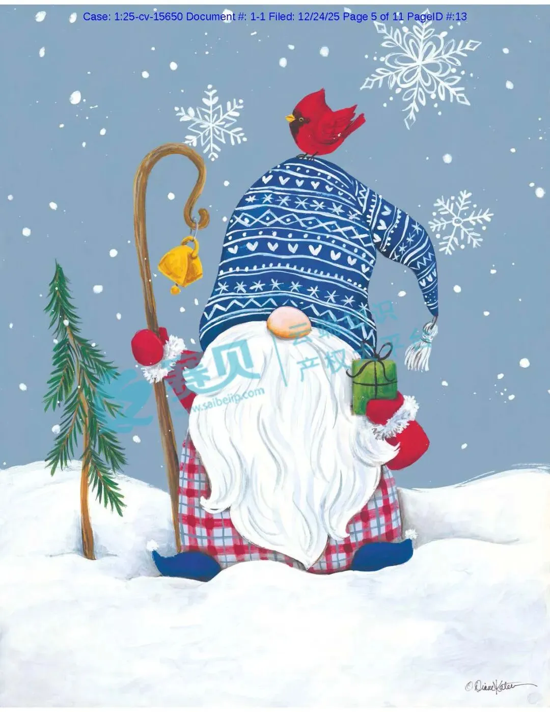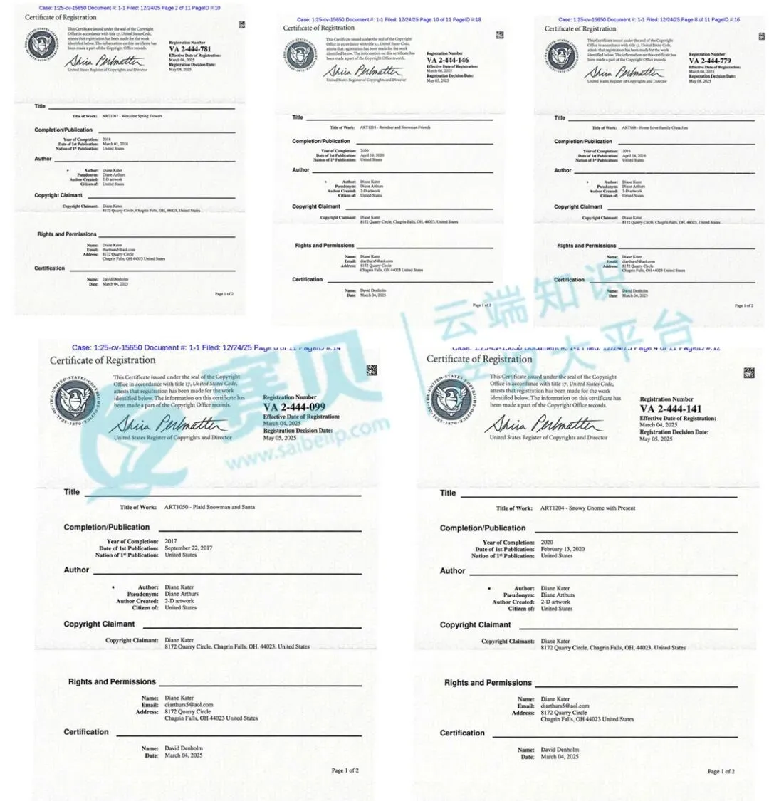 【25-cv-15650】30家涉案!花卉/圣诞雪人/地精/驯鹿等5项主题版权TRO维权,Diane Kater作品侵权风险高!