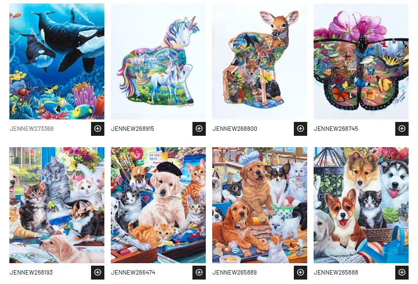 Jenny Newland是知名签约艺术家,作品以明快温暖的花园和乡村景色为背景的小狗小猫主题插画为主,线条柔和、色彩丰富,这些作品深受买家喜爱。常见于贺卡、横幅、拼图、礼品罐、马克杯、T恤衫领域。