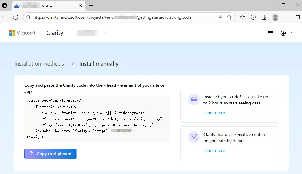 注册 Clarity 并为网站创建新项目后,接着需要安装跟踪代码才能开始在你的网站上使用 Clarity,