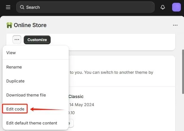 找到网站目前正在使用的“Current theme”(实时主题),接着点击右侧三个点状的菜单操作按钮,然后下拉菜单选择“Edit code”(修改代码),