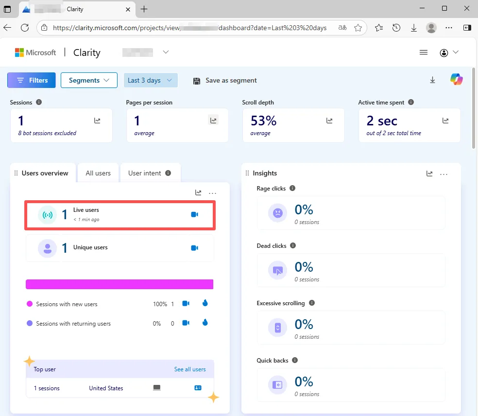 你可通过在浏览器中输入并访问你的网站,然后返回 Clarity 后台查看实时用户数据,来验证 Clarity 追踪代码是否已正确添加。实时用户(Live Users)数据实时统计当前有多少用户正在浏览你的网站,每分钟更新一次。
