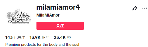 @milamiamor4通过发布产品展示以及产品介绍视频,在TikTok上不断地吸引流量,目前拥有13.9K关注。