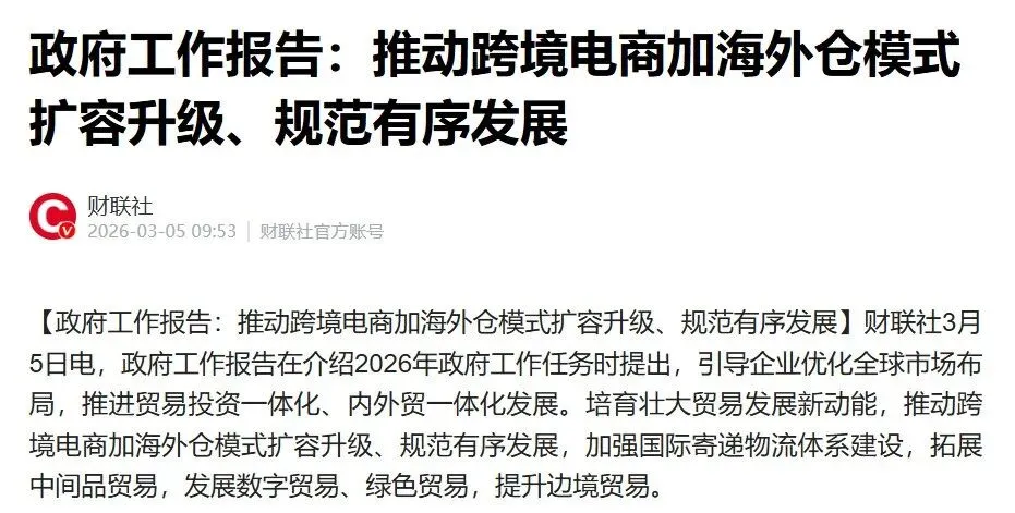 过去一年中国外贸出口表现亮眼,总规模达26.99万亿元,同比增长6.1%,跨境电商在稳住外贸基本盘、推动产业升级中起到了关键作用。2026年政府工作报告对跨境电商的要求,从之前的“促进发展”升级为“扩容升级+规范有序”,再加上海外仓、国际物流、数字贸易等配套政策的支持,意味着这个行业不再是野蛮生长,而是进入了规模化、体系化、合规化的全新发展阶段。