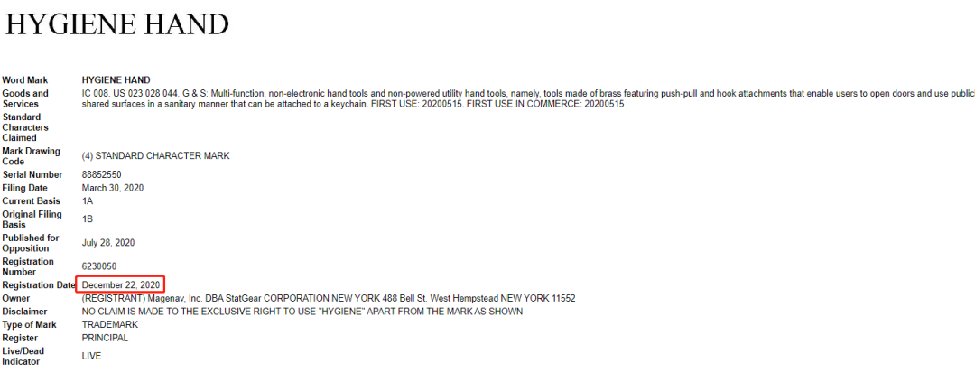 Hygiene Hand已注册成商标,获批注册时间为2020年12月22日: