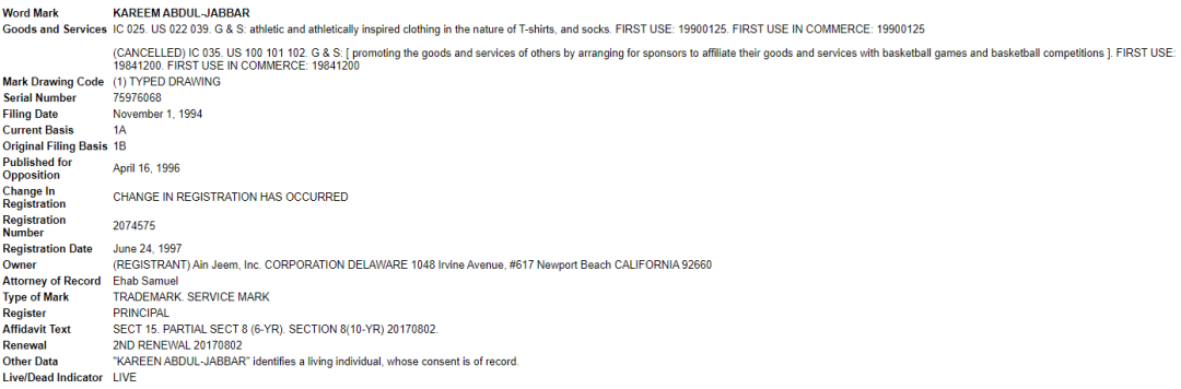 卡里姆·阿布杜尔-贾巴尔,前美国职业篮球运动员,文字商标、图案logo等是侵权雷区。