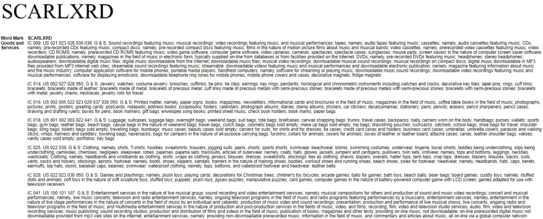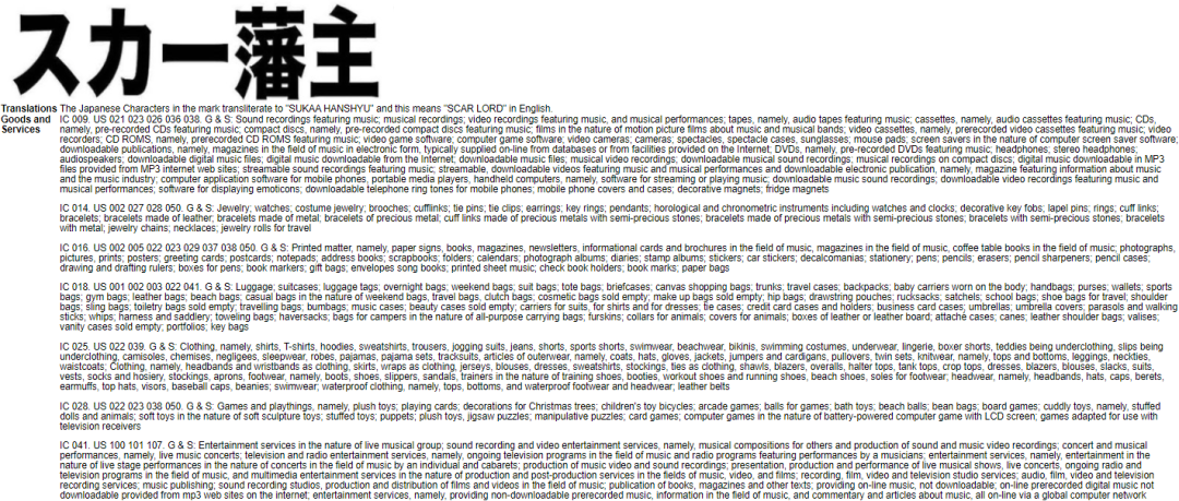 又如说唱歌手Scarlxrd,Scarlxrd及其专辑名称スカー藩主都是侵权雷区,两个商标注册类别较多,卖家要小心。