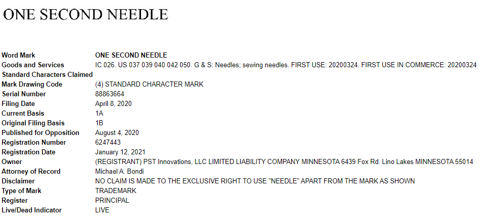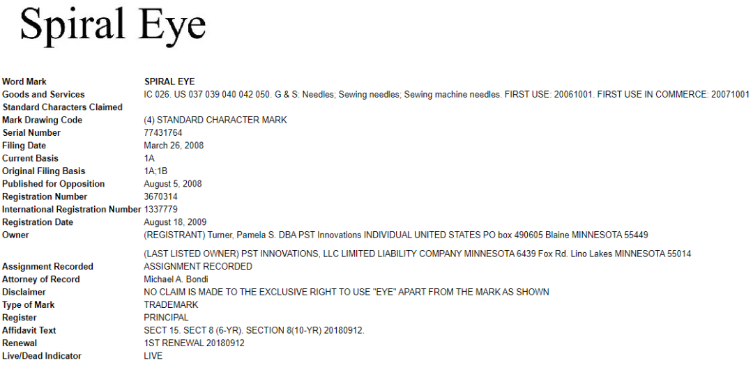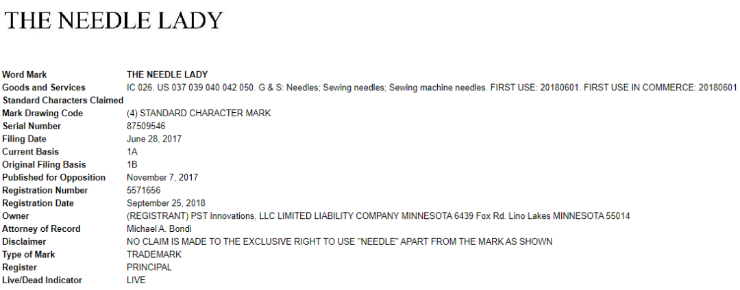主要涉及3个文字商标,分别是ONE SECOND NEEDLE、SPIRAL EYE和THE NEEDLE LADY: