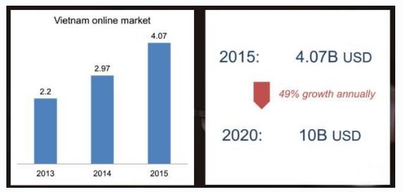 若按照估测速度增长(49%/年),到2020年,越南电商市场价值或将达100亿美元。