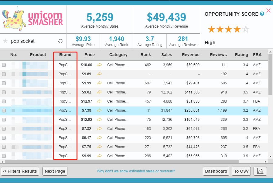 纵观这两年在亚马逊上大火的产品,无论是去年的指尖陀螺、平衡车或者今年炒得纷纷扬扬的剥蛋器、变脸公仔,其实不难看出,设计新奇、用途有趣的产品越来越受到消费者的信赖,但是这类产品很容易涉及外观侵权行为。所以卖家在选择这类产品时应当先到相关知识产权网站上进行相关查询。 而还有另一种侵权行为,就是商标侵权,也十分常见。这也是让卖家十分头疼的,因为这种侵权卖家其实不易察觉。有的时候,卖家可以通过listing的火爆程度和同款卖家的数量来判断是否具有知识产权保护,但是这也并非是绝对的。 其实只要卖家愿意将这个关键词在相关国家的商标网站上查一下,其实就可以避免上架后收到侵权律师函的悲剧。 有些产品看起来不错,像是蓝海产品。但是实际上可能被大卖或者本身就是亚马逊的自营产品,能够供新产品进入的空间并不大。卖家如果只是盲目的看到产品的数据,后期可能就只能被吊打,销量可能寥寥无几。 卖家可以通过Unicorn Smasher来判断这个点。 具体操作如下: 1、在亚马逊前台搜索中输入关键词,这里输入的是“pop socket ” 2、点击Unicorn Smasher获取选品数据 3、在品牌一栏中可以看出,“pop socket”这个品牌频繁出现 这本身就是个品牌,在其中有极大销量。其他品牌要不被碾压,要不被侵权赶出市场。这个关键词下的产品已经被大卖所垄断,强行加入后期获利的机率被大大降低,并且可能存在风险 并且查看品牌名这个方式其实也适用于找亚马逊自营品牌,如今,亚马逊已经引入了800多个自营品牌,有些品牌看起来与亚马逊似乎没什么关系,但却也归属其中,探知到品牌名称,就可以与亚马逊的自营品牌进行对比,避免与亚马逊扶持的品牌正面交锋,减少损失。 很多卖家收到差评并不是因为产品本身的质量问题,更多时候是因为消费者不会使用。因为不会使用所以他们会觉得跟描述的不大相符,觉得货不对板,因此差评也就很难避免。这种情况常见于用途比较复杂的比如电子类、手机类、投影仪等产品。 其实类似这种情况卖家有的时候可以在选品过程中就可避免。方法是通过同行的review得出结论,review中如果很多描述这类问题卖家就要警惕了。如果卖家真的看好某款产品,最好还是针对review中讲到的欠缺的点,专门出一个自己的描述或使用说明。将使用方法讲清楚,避免后期投入后踩坑! 一些卖家看到竞争对手某款产品销量不错,售价高,就盲目估算产品的毛利润在50%以上甚至更高,就不管产品的成本价,自信认为自己肯定能做好,盲目挑选供货商然后上架。后期如果遇到需要打折出售引流的情况又觉得肉痛,不愿打折或者太高价格再促销,这样反而适得其反。其实,特别是小团队或独自经营的卖家,面对成本在100元以上的产品就需要慎重了。 在选品的过程中,最好用Unicorn Smasher的一键跳转阿里巴巴国际站功能查看关键词选品的价格,多方比较底价,避免投入太大,后期损失。 警惕假性销量爆表产品,寻求变体中的爆款 有些卖家选品时只关注整体数据,看到销量爆表的产品就认为其中机遇很大,却不知道这个数据其实会存在某些“水分”。这里所指的水分并不是造假或者其他,而且产品本身拥有极多的变体,比如颜色、尺寸、样式,而选品时卖家往往只关注到整体数据,而忘了细致分析是否是某一个变体的特殊性所带来的巨大的销量变化,当然也忽略了这个销量是否含有某个变体的价格变动因素。 作为中小卖家,不可能为一款产品的所有变体一一备货。在资金有限的情况下,并且也是为了缩短客户思考的时间,不让众多的选择影响客户的判断,流失一些有选择困难症的客户,卖家只能选择最好不超过五个,有潜力并且表现不错的变体。