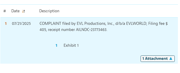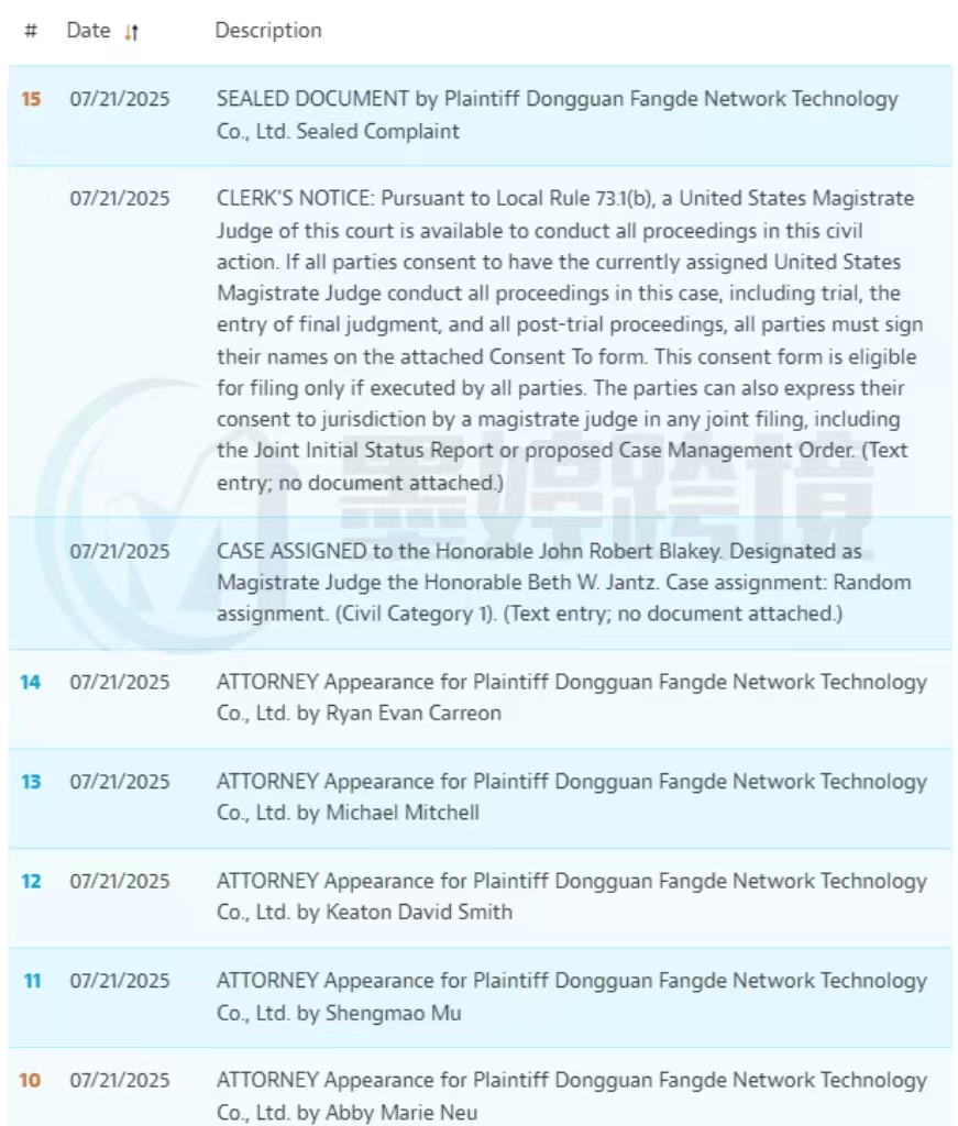 本案于2025年7月21日发起侵权诉讼,案件号:25-cv-08277,原告尚未提起TRO禁令(Temporary Restraining Order,临时限制令)的动议。