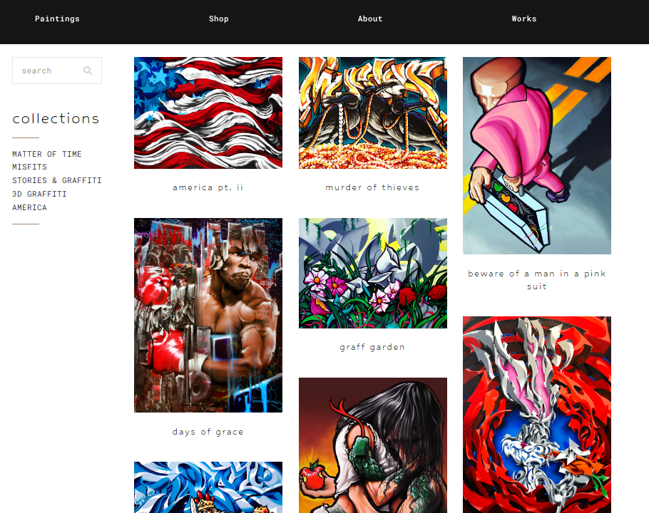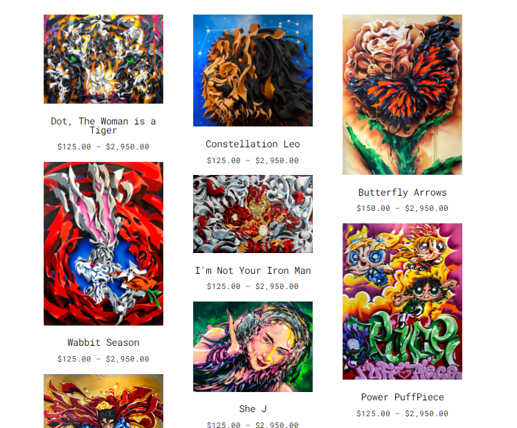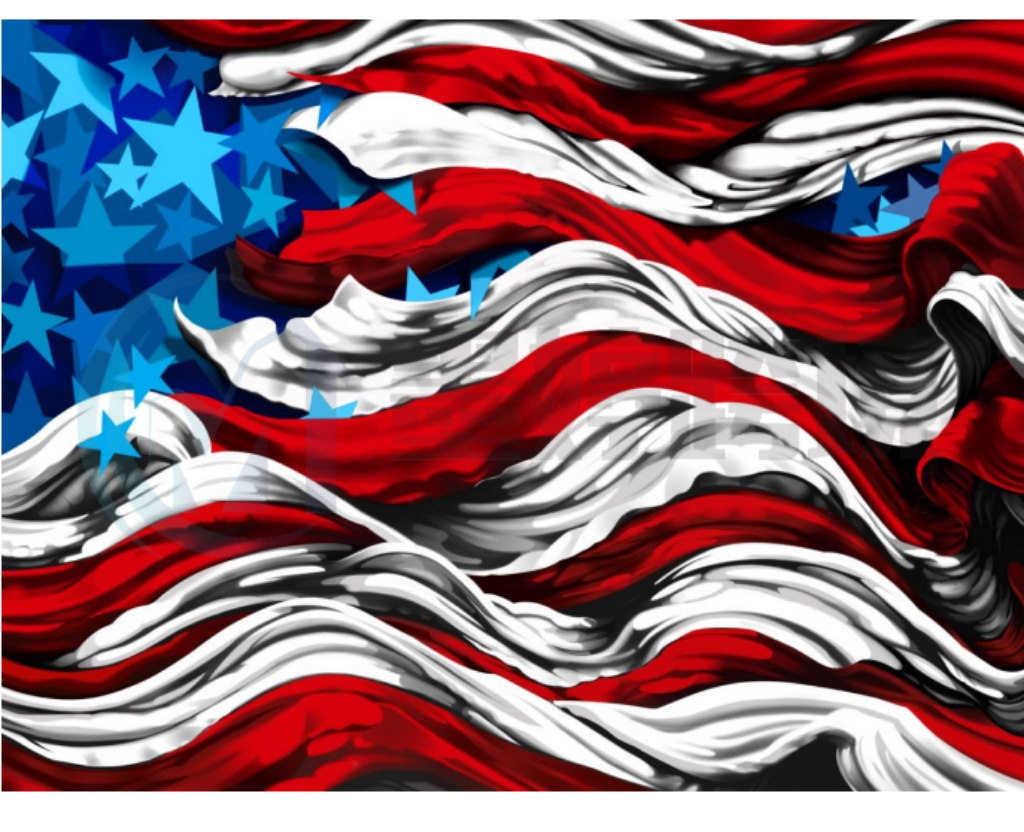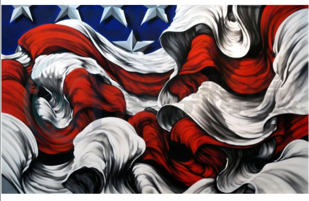 Erni Vales Works 系列图像,色彩浓烈、构图夸张,常以美国国旗、骷髅、女性肖像等为灵感符号,具强烈识别度。该系列已在美国注册版权,致力于保护艺术家的原创权益及品牌价值。
