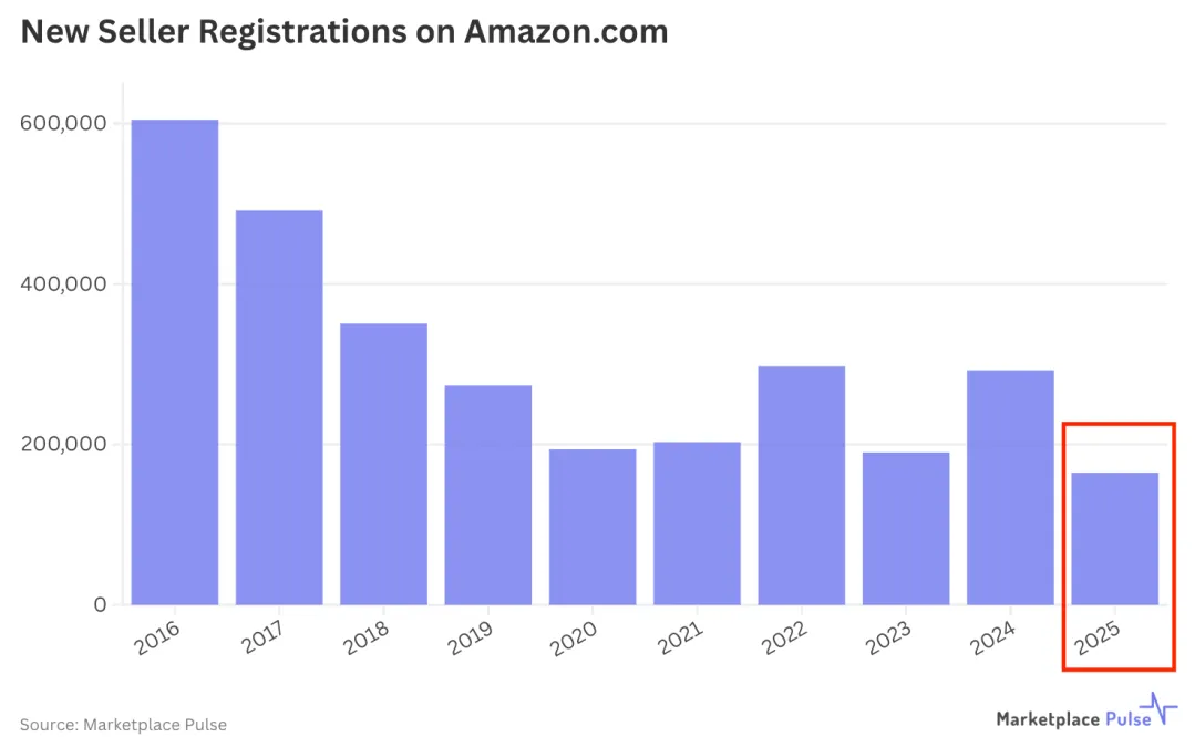 当Marketplace Pulse的最新数据砸向跨境圈——亚马逊2025年新卖家注册量仅16.5万,较十年前2016年的60万暴跌超七成,直接退回“跨境电商”概念尚未普及的年代——无数运营者心头一震。