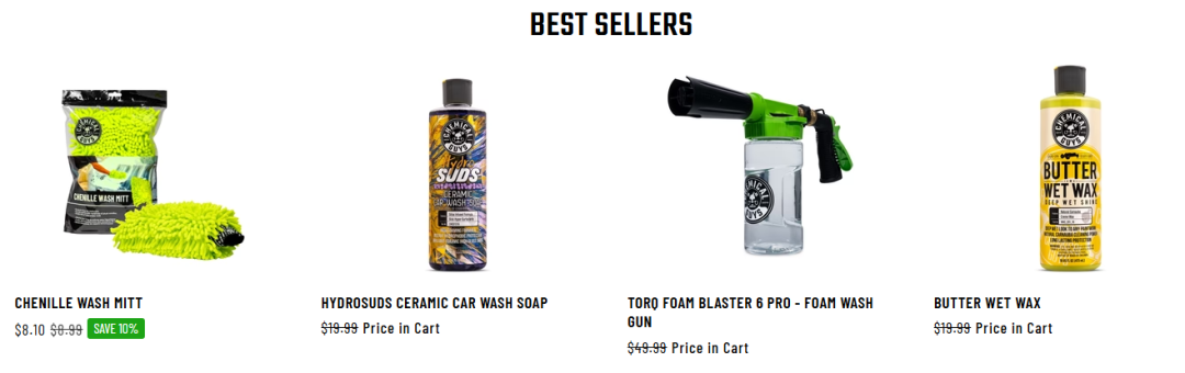 Chemical Guys 拥有自己的官方独立网站,用以面向全球用户销售产品。消费者可直接在官网下单购买,而对于部分不支持直接配送的国家,消费者可通过转运公司购买心仪的产品。根据独立站主页显示,雪尼尔水洗手套、陶瓷洗车皂、泡沫清洗枪和黄油湿蜡最为畅销。