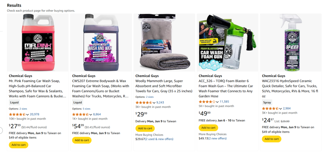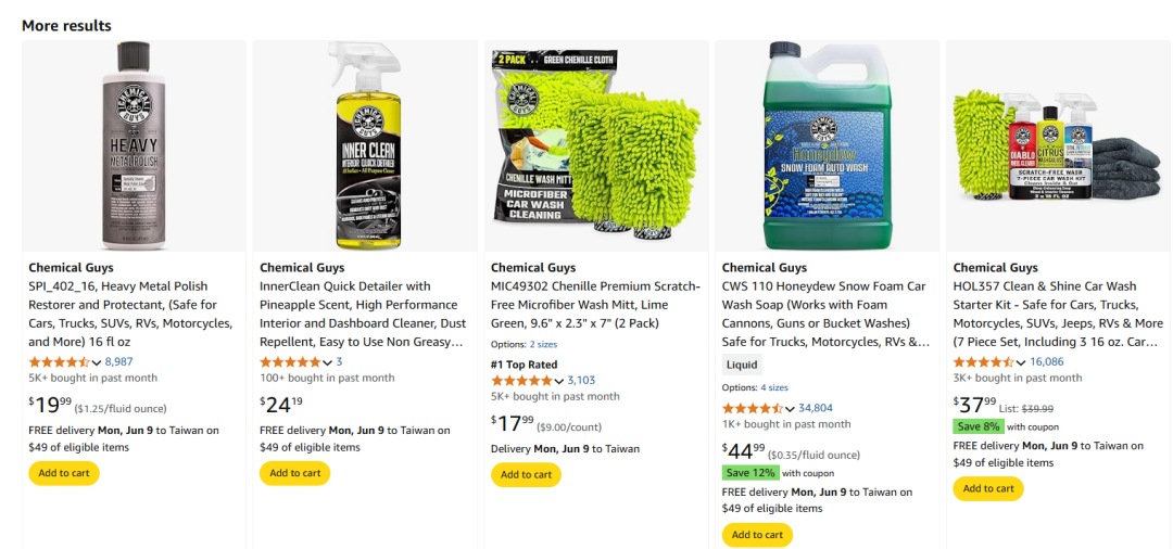 在亚马逊等国际知名电商平台上,Chemical Guys 设有官方店铺。其产品涵盖清洁剂、抛光机、超细纤维毛巾等多种汽车护理用品,且可配送至全球多个国家和地区,方便全球各地消费者购买。