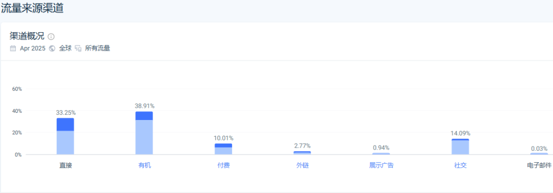 其独立站流量结构较为健康,呈现自然流量主导的特征。
