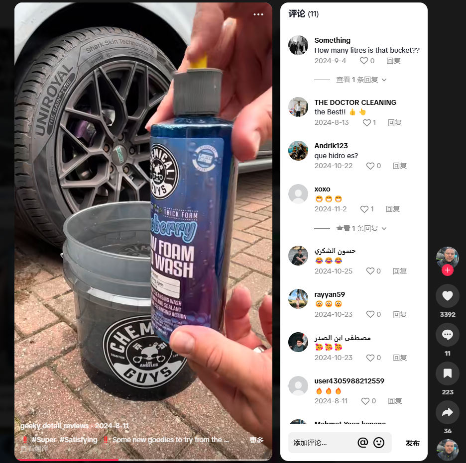他介绍Chemical Guys产品的视频获得了1982次点赞,507次收藏。对于功能类产品,直观地展示使用方法和使用前后的对比图更能抓住消费者的需求,而评论区的留言互动则方便消费者表达自己对产品的真实想法,便于品牌改善产品效果,更好地贴合消费者的需求。