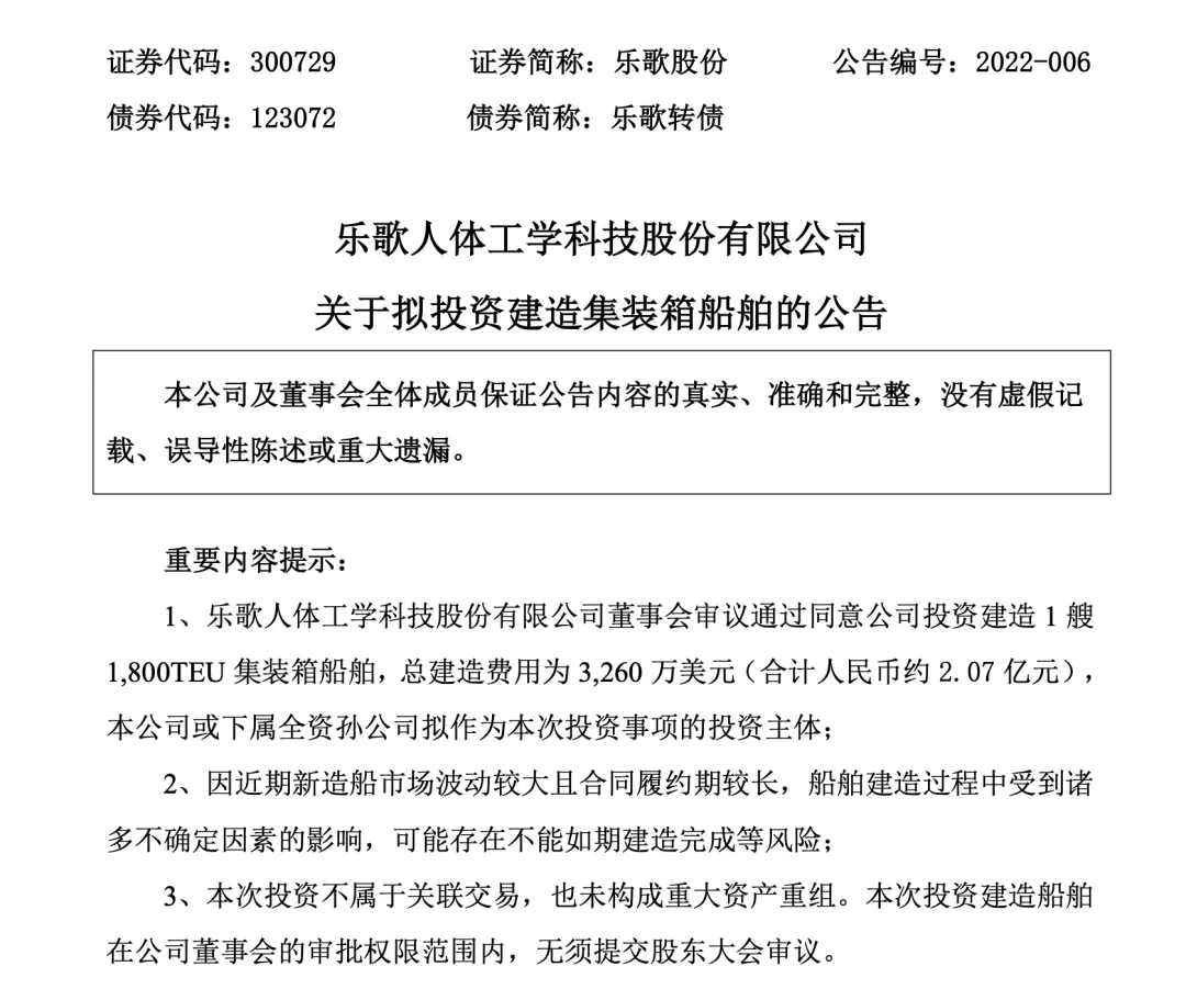 1月27日晚间,跨境上市大卖乐歌股份公告称,拟拿出2.07亿元,与国内一流船厂签订1艘1800TEU集装箱船舶建造合同,预计2023年3月交船。同日,乐歌股份还披露拟在新加坡投资3000万美元设立全资孙公司,该公司经营范围主要包括无船承运业务、国际集装箱船运输、国际货物运输等。
