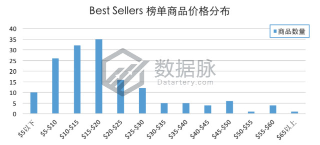 本期分析中Toys & Games品类Best Sellers榜单商品最高价$69.99,最低价$0.4,平均价格$19.76。骆探长(shujumai.com)发现,上榜商品的平均价格与上期相差无几;在$15.00-$20.00区间内的商品数量最多,占比达21.34%;有19.51%的商品价格分布在$10.00-$15.00;此外,仅有1款商品价格超过$65,占比为0.61%。