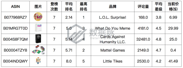 可以看到,在本期 Toys & Games 品类的 Best Seller 榜单中排名前五中,骆探长(shujumai.com)发现,品牌 L.O.L. Surprise!的“Lil Sisters”版惊喜娃娃球连续四次登顶榜,以平均排名2.14蝉联综合排名首位;