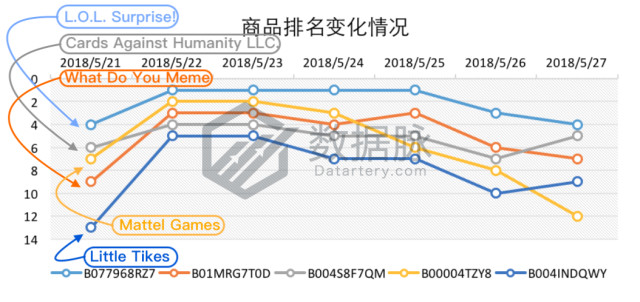品牌What Do You Meme的卡牌游戏以及品牌Cards Against Humanity LLC.的反人类游戏卡的综合表现稍有回暖,分别以平均排名5.0、5.14位列综合排名第二、三位;