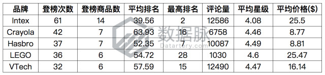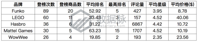 2018年5月21日至2018年5月27日共有608款商品登榜亚马逊Toys & Games品类的相关榜单,其中涉及品牌数268个。截至2018年5月27日,登榜商品总评论数达403039条,平均星级4.3星。