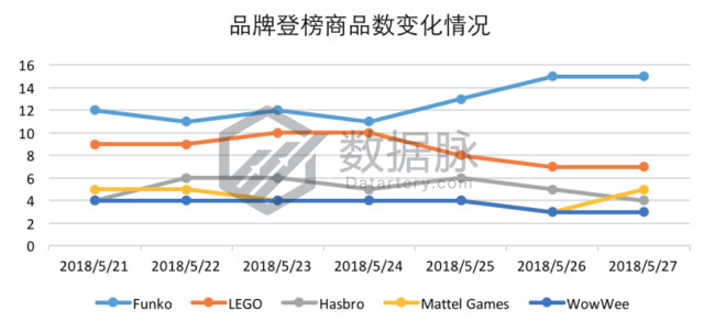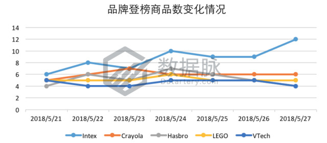 可以看到,在本Toys & Games品类的Best Seller榜单分析中,骆探长(shujumai.com)发现,品牌竞争激烈,充气气垫品牌Intex自5月24日起,每日至少登榜9款商品,累计登榜61次,荣膺品牌排名之首;彩色蜡笔品牌Crayola每日登榜商品数表现稳定,共有7款商品登榜,累计登榜42次,位列品牌排名第二位;棋盘游戏品牌Hasbro共有7款商品登榜,共计登榜37次,位列品牌排名第三;积木品牌LEGO每日至少登榜5款商品,以登榜36次位居品牌排名第四;儿童玩具品牌VTech登榜6款商品,以累计登榜32次位列综合排名第五。