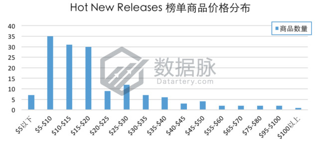 在Toys & Games品类Hot New Releases榜单分析中,商品最高价$369.99,最低价$2.99,平均价格$23.84。骆探长(shujumai.com)发现,上榜商品的平均价格小幅度上升,较多的商品位于$5.00-$10.00区间以内,占比21.74%;有19.25%的商品位于$10.00-$15.00;在Hot New Releases榜单中,仅有1款商品价格高于$100,占比为0.62%。