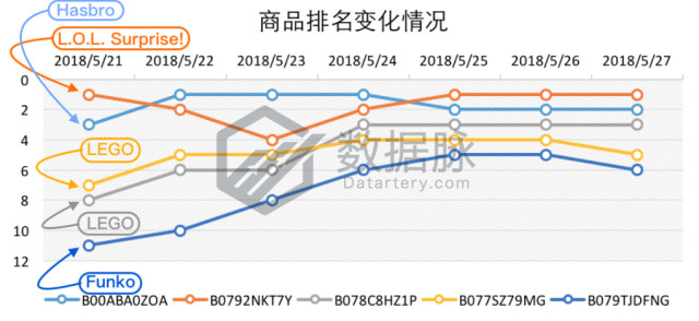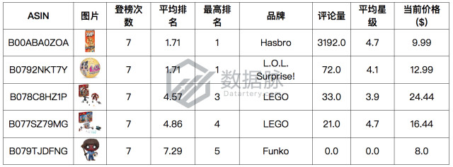 品牌Funko的“死侍”人偶榜单排名稳定上升,以平均排名7.29位列综合排名第四。