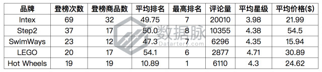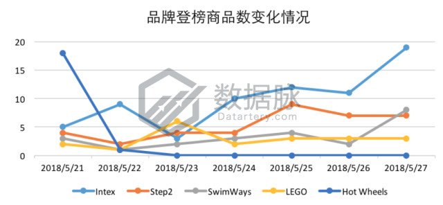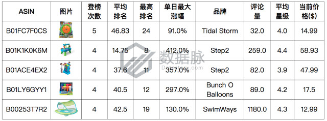 品牌Step2的游乐水盘登榜4次,以平均排名14.75位居综合排名第二位,其单日最大涨幅为412.0%;