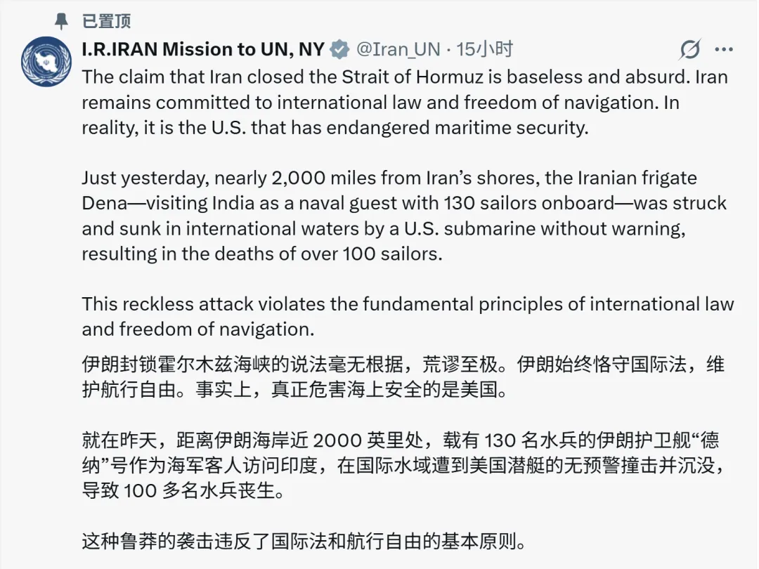 新华社及伊朗媒体报道,伊朗常驻联合国代表团当日通过社交媒体发文明确,所谓“伊朗封锁霍尔木兹海峡”的说法毫无根据,伊朗始终恪守国际法,维护国际航道的航行自由。