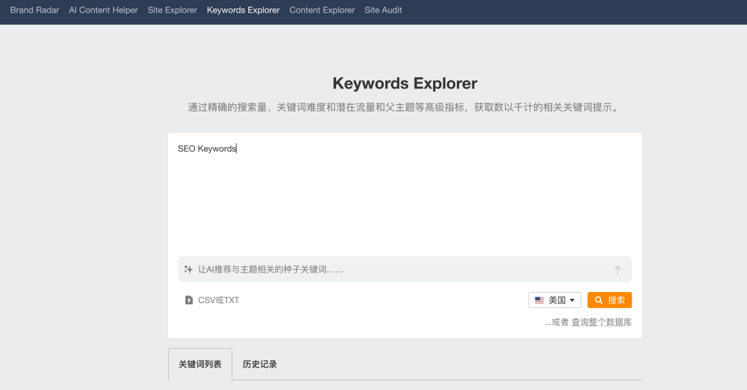 1,在ahrefs后台,keywords exploarer输入你产品的主要关键词