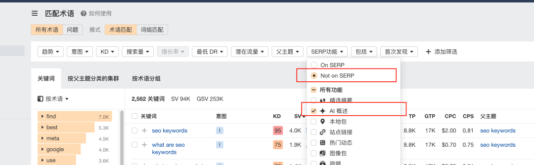 3,在上面的SERP中选择not on SERP+AI概述,筛选出没有出现在传统SERP但是目前能够触发AIO的关键词