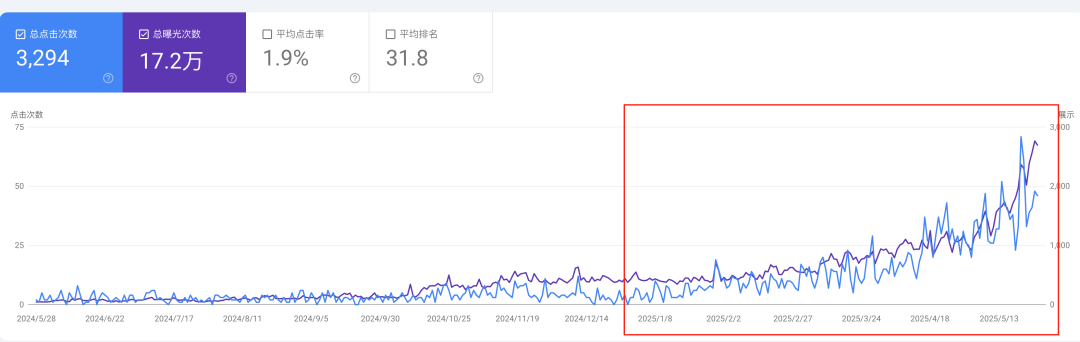 我们使用这个下蛋机给客户代运营的结果展示,文章全部AI自动完成,自然流量一直在飙升,目前每天的询盘稳定在2-3个。