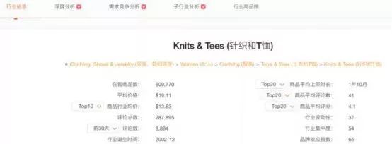 以Knits&Tees(针织和T恤)为案例说明,颜飞介绍道,卖家可以针对自身的主营业务,从一级类目到细分品类的行业排名、上架时间、价格等通用特征,多角度筛选调研,快速挑选目标类目。与此同时,还可利用目标产品的数据更新及类目纵向对比,点击进入商品详情页针对产品细节做精细化选品。