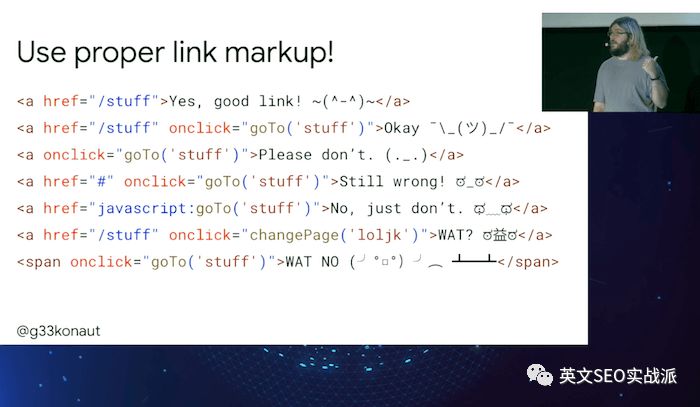 近日在FRONTEND CON大会上,Google工程师Martin Splitt在演讲中称,最好使用标准的链接标记格式,这样对搜索引擎较友好。什么是标准格式呢?也就是用了二十年之久的这种形式: