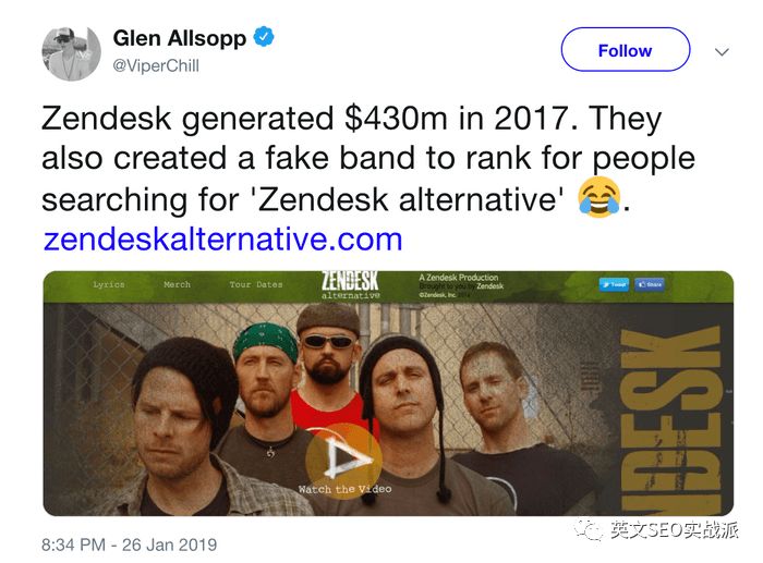 有这么一类商业意图很强的关键词:XXX alternative(某某产品的替换品),用户搜索意图很明确:寻找XXX产品的替代品。如果你是XXX公司的SEO,该怎么办呢?Zendesk或许可以给你一点启示,它的客服团队不仅注册了ZendeskAlternative.com这个域名,还制作了一个短视频来展示自己团队的音乐天赋,看后简直让人笑喷,太有才了!我想,寻找Zendesk替代品的搜索用户看了后,一定也会狂笑,估计都会放弃寻找替代品的念头,就用Zendesk吧,顺便联系他们客服领教一下他们的幽默,哈哈。