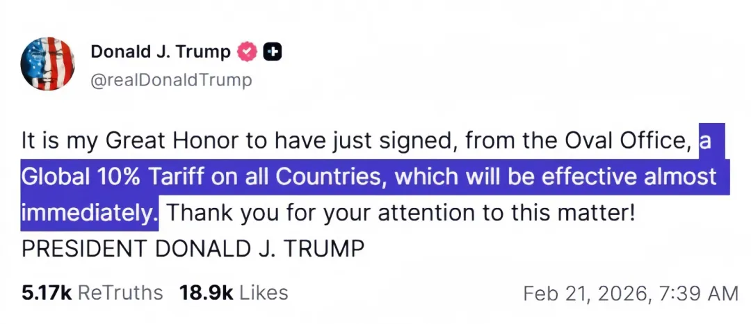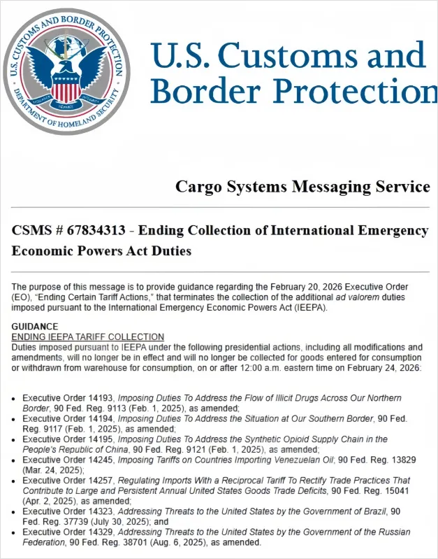 今日起!旧关税停止征收,10%临时关税生效从“暂停”到“替代”,美国贸易政策正在进入新的不确定阶段。此前AMZ123在文章中提及,2025年10月底美国宣布延长对部分中国商品24%加征关税的暂停期限至一年,一度让跨境行业短暂找回了一点确定性。美国进口商重新补库存,卖家开始重谈报价,甚至有人认真讨论起“成本正常化”的可能。但如今春节刚过,美国贸易政策又突然踩下新的油门。AMZ123获悉,近日,美国海关与边境保护局(CBP)发布最新执行通知,宣布自2026年2月24日起停止征收依据《国际紧急经济权力法》(IEEPA)实施的一系列紧急关税措施。其中包括此前备受关注的“对等关税”、“芬太尼关税”,以及部分以国家紧急状态为依据推出的全球性临时关税安排。