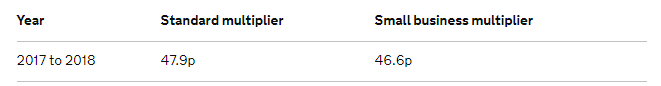 2)按下表当前税年所列,选择适用的乘数,如果征税估定价值小于£51,000,可使用小企业乘数 Small business multiplier——46.6p;