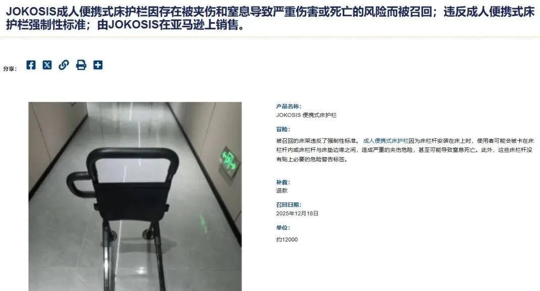 又一款中国制造的亚马逊热销产品被推上风口浪尖。美国消费品安全委员会日前发布通知,召回约1.2万件JOKOSIS品牌成人便携式床护栏,原因是该产品存在致命安全隐患,可能导致使用者夹困和窒息。