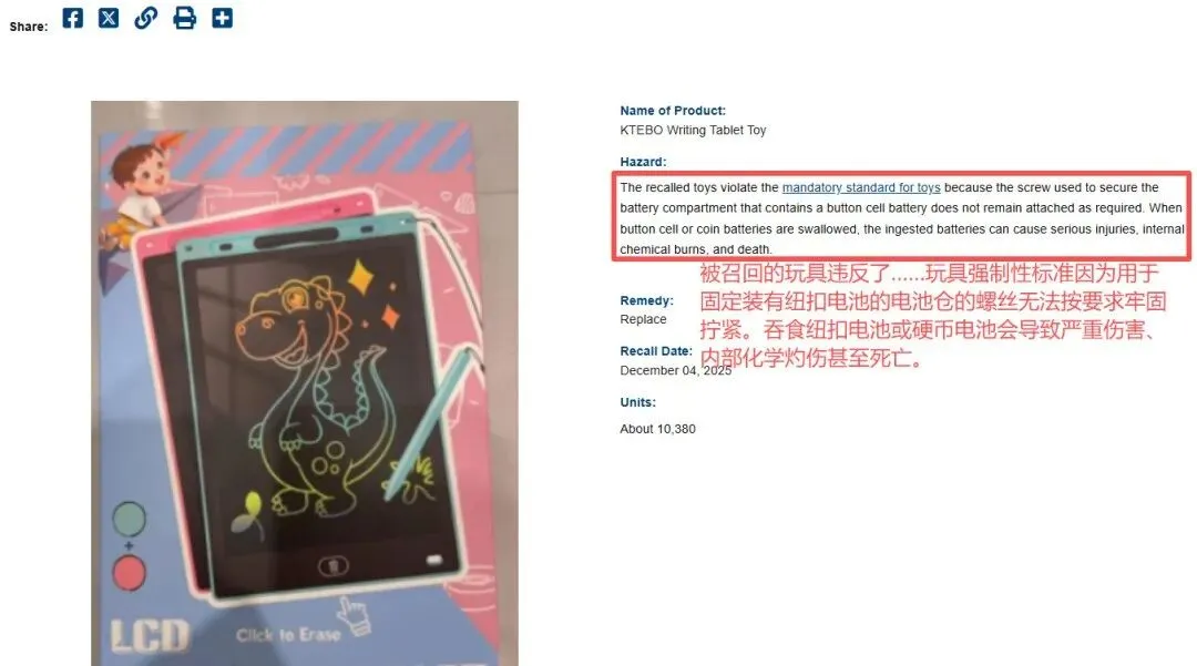上个月,KTEBO品牌在亚马逊平台销售的儿童书写板玩具被紧急召回,原因是其电池仓固定螺丝无法保持牢固,纽扣电池有外露风险,“未能满足玩具安全强制标准”。