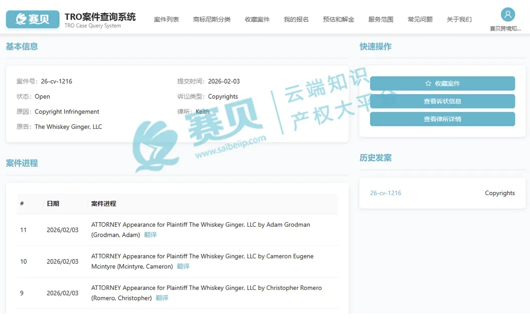 从赛贝TRO案件查询系统获悉,一起涉及十张版权插画的TRO案件26-cv-1216在美国伊利诺伊州立案,代理律所为Keith,原告为THE WHISKEY GINGER, LLC,赛贝将为跨境电商卖家提取案件核心信息、原告及律所详情、涉案版权清单等关键内容。