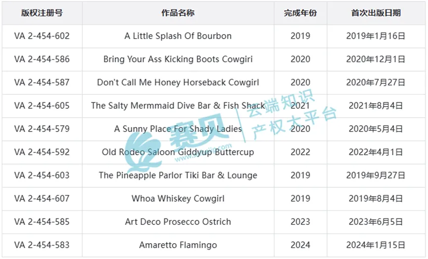 以下版权作品均为“Work made for hire”(雇佣作品),原告The Whiskey Ginger作为版权 claimant,享有独家的复制、发行、衍生创作、推广销售等相关权利,赛贝提醒跨境卖家,未经授权不得擅自使用,以免引发侵权风险。