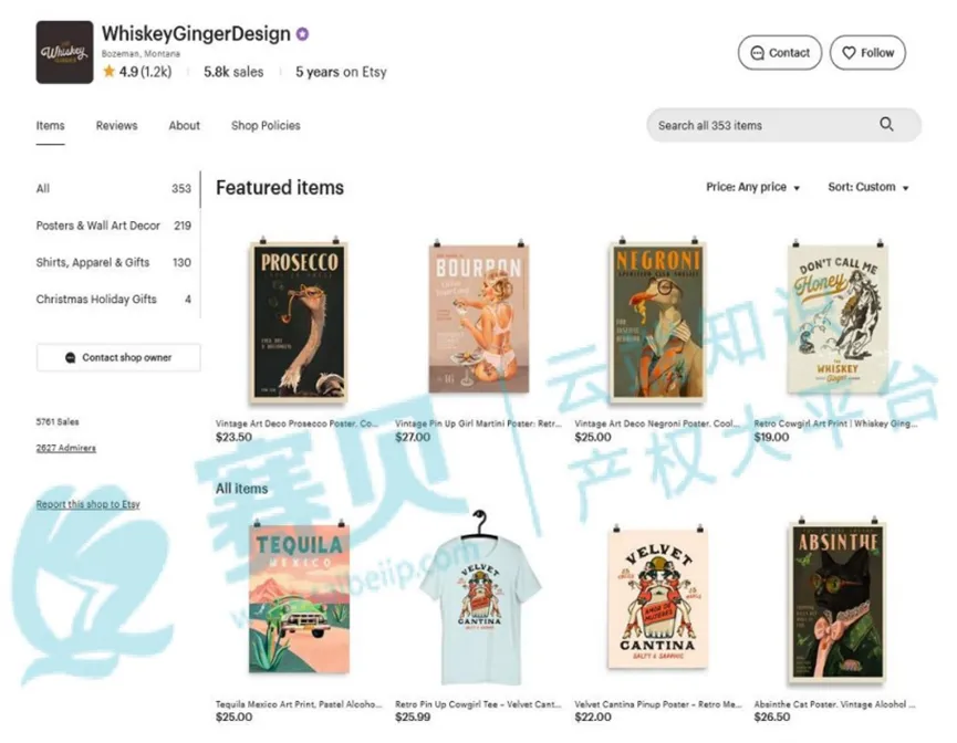 本案原告为THE WHISKEY GINGER, LLC(以下简称“The Whiskey Ginger”),是一家专注于复古风格设计的美国品牌,专注于复古海报插画(vintage pinup illustration)、复古西部女牛仔艺术(retro western cowgirl art)、旅行艺术版画(travel art prints)及带有威士忌风格的趣味家居饰品(cheeky home furnishings with a whiskey twist)
