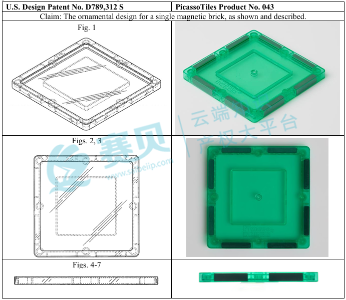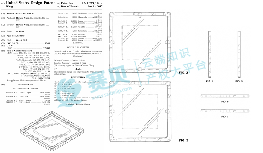 案件涉及专利为 “单一磁吸积木”(Single Magnetic Brick)的外观设计专利,由 Howard Wang于2015年10月6日提交申请,2017年6月13日获授权。 美国外观专利侵权判断的核心是 “普通观察者测试”,即普通消费者会不会把你的产品和专利设计搞混。
